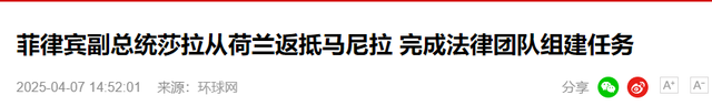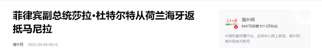 菲律宾副总统莎拉・杜特尔特在海牙经历了近一个月的奔波后,于 6 日晚间连夜乘飞机返回马尼拉。她此番前往海牙,是因为 3 月中旬菲律宾警方在某些势力的 “协助” 下,逮捕了刚从海外飞抵马尼拉国际机场的前总统杜特尔特,并迅速将其送往海牙受审。